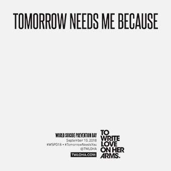 Start by downloading our response card and filling out the “Tomorrow needs me because…” prompt. Share it online and use #WSPD18 and #TomorrowNeedsYou when posting. Don’t forget to tag @TWLOHA on Twitter and Instagram so we can see it!