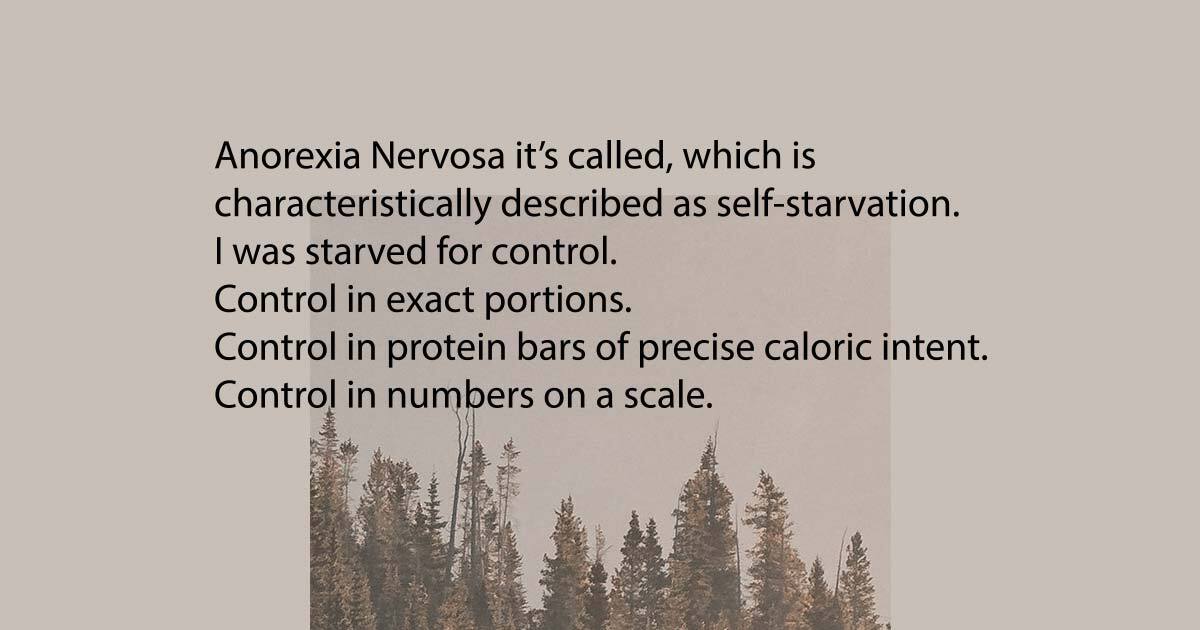 The control led to the Not-Eating thing, which is really the ultimate form of control. Anorexia Nervosa it’s called, which is characteristically described as self-starvation.