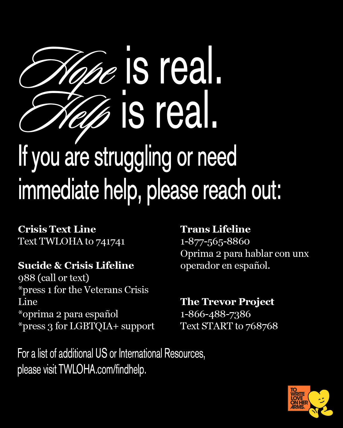 Save these resources on your phone or somewhere you can easily access them so that you are prepared if and when you, or someone you know, are in need of additional support. You can also share this list of resources on social media so others can access help when they need it.